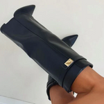 Valdève est cette botte. Haute, structurée, confectionnée en cuir et suède premium avec un talon bloc stable de 8,5 cm qui offre hauteur et assurance sans sacrifier le confort. Le détail rabat subtil sur le dessus apporte ce caractère distinctif qui distingue une botte ordinaire d'une pièce que l'on remarque. Portez-la avec un jean slim, une robe maxi ou un pull oversize — Valdève s'adapte à tout sans jamais s'effacer.